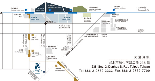 After get off the MRT, please turn left and walks along Keelung Rd about 7-10 minutes.K Hotels Dunnan is on the corner of Dun Hau S RD.