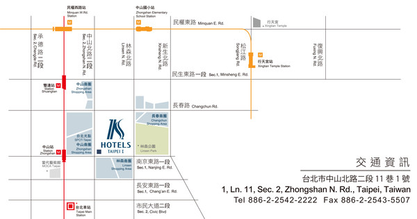 Take Taipei MRT Tamsui-Xinyi line to Zhongshan Station Exit3. Go straight to Zhongshan Police office and turn left. It will takes only 5 minutes to get K Hotels Taipei I.
